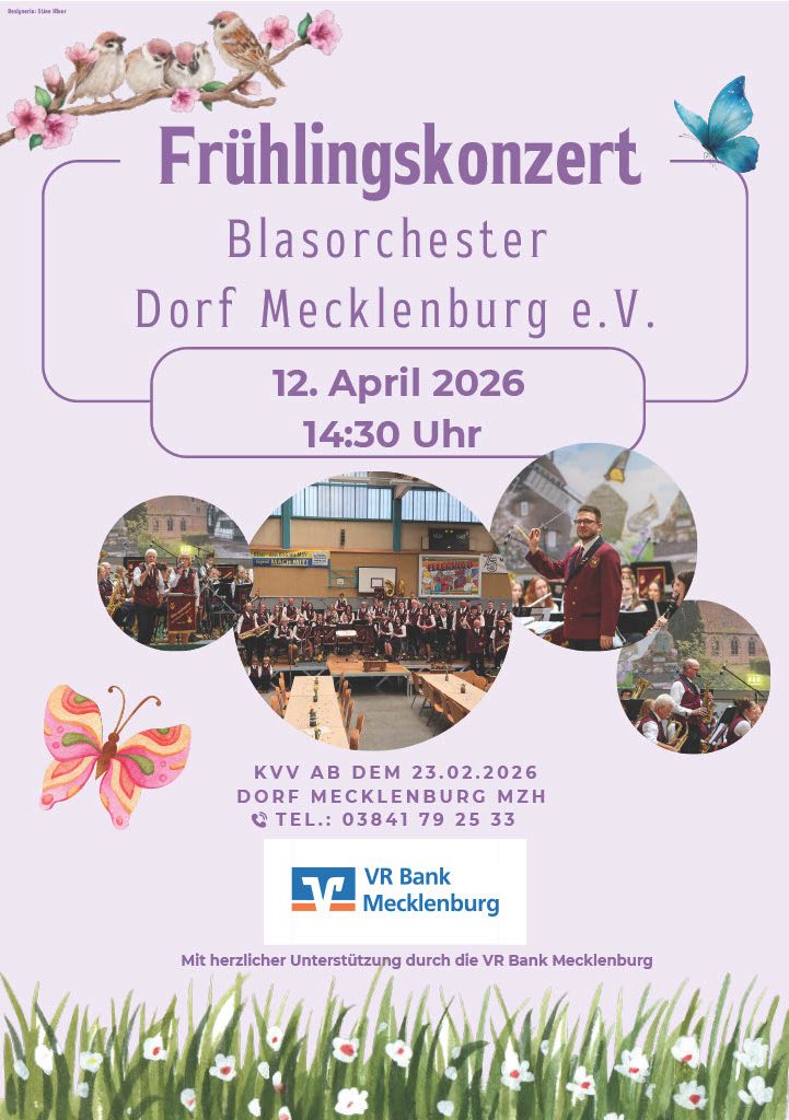 Seit heute sind unsere neuen Plakate für unser Frühjahrskonzert am 12.04.2026 da. Der Kartenvorverkauf beginnt am 23.02.2026. Reservierungen sind vor Ort in der Mehrzweckhalle Dorf Mecklenburg oder unter der Telefonnummer 0341 79 25 33 möglich.