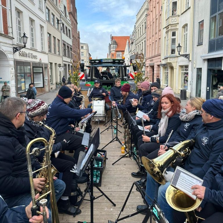 Am 05.10.2025 hatten wir die Ehre, den Festumzug des Landeserntedankfestes in Wismar zu begleiten. Dieser startete am Alten Hafen, führte durch die Altstadt bis zum Marktplatz. Auf einem Anhänger, gezogen von einem Traktor der Wariner Pflanzenbau e.G., nahmen wir Platz